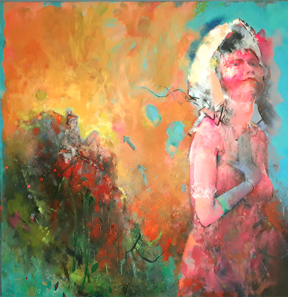 Caricatured young soldier, helmet too tight, commands K9 operations — innocence twisted by mankind’s warlike impulse.